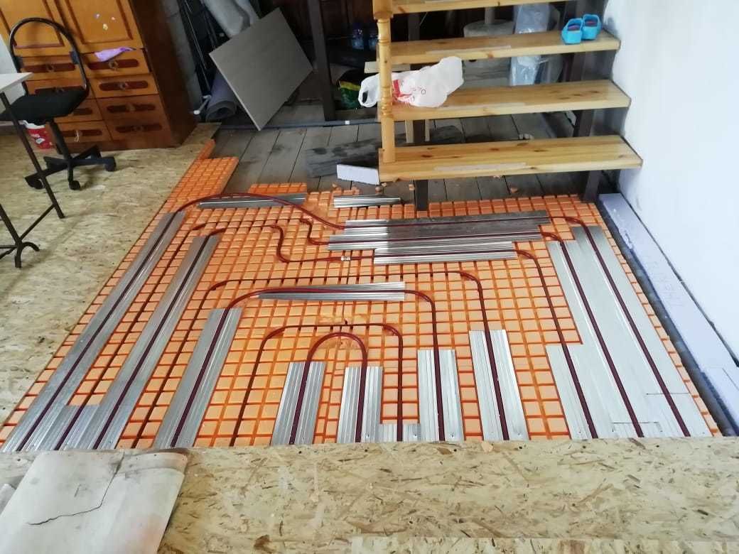 В квартирах, высота потолков не позволяет сделать большой "пирог" теплого водяного пола, а также отсутствует возможность его установки. Тут используется сухой метод, в процессе которого используются теплораспределительные пластины. Это решение всех вопросов.